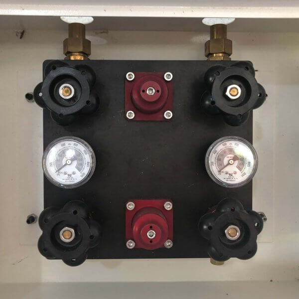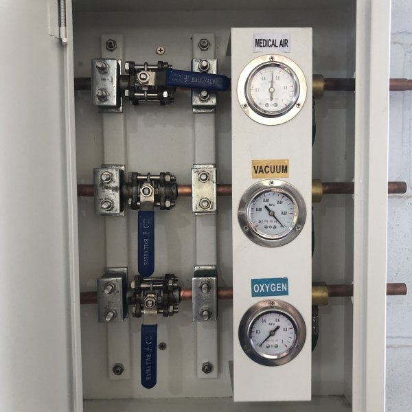 Las válvulas de corte de zona se encuentran alojadas en un tablero con tapa y se utilizan para aislar las distintas zonas dentro de una institución sanitaria con fines de mantenimiento y de emergencia. Los tableros cuentan con un manómetro/vacuómetro para cada gas y con válvulas esféricas de corte.